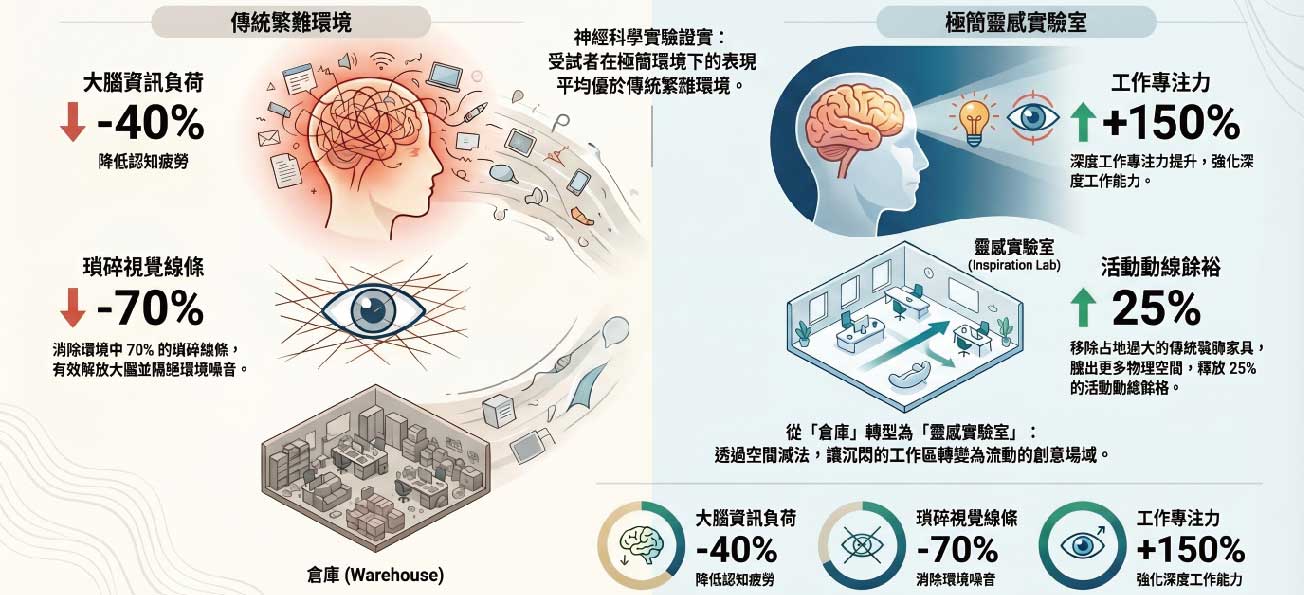 當環境回歸純粹,大腦負責高級認知功能的前額葉皮質能從環境處理中解放,將能源精準投向複雜的商業邏輯與創意發想,「少」了干擾,「多」了產值,這就是極致極簡的商業邏輯。
