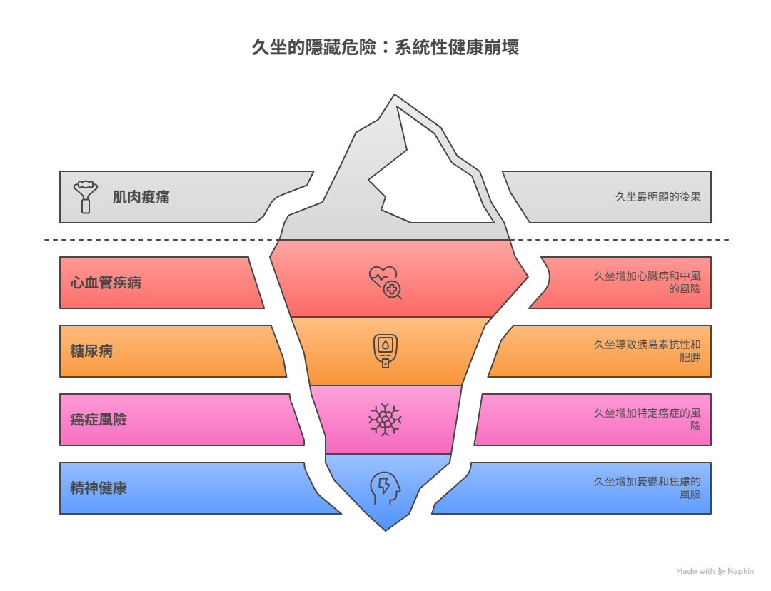 換句話說,久坐的影響不僅是「肌肉痠痛」這麼簡單,而是對整個身體系統的長期侵蝕。