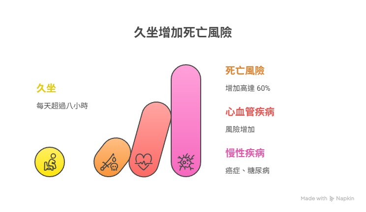 世界衛生組織(WHO)最新數據和多項科學研究均顯示,久坐或身體缺乏活動已成為全球第四大死亡危險因子,僅次於高血壓、吸菸和高血糖。 長時間坐著不動與多種健康風險高度相關,包括心血管疾病(如冠心病、中風)、血糖代謝異常(如第二型糖尿病)、某些癌症及早死風險增加。