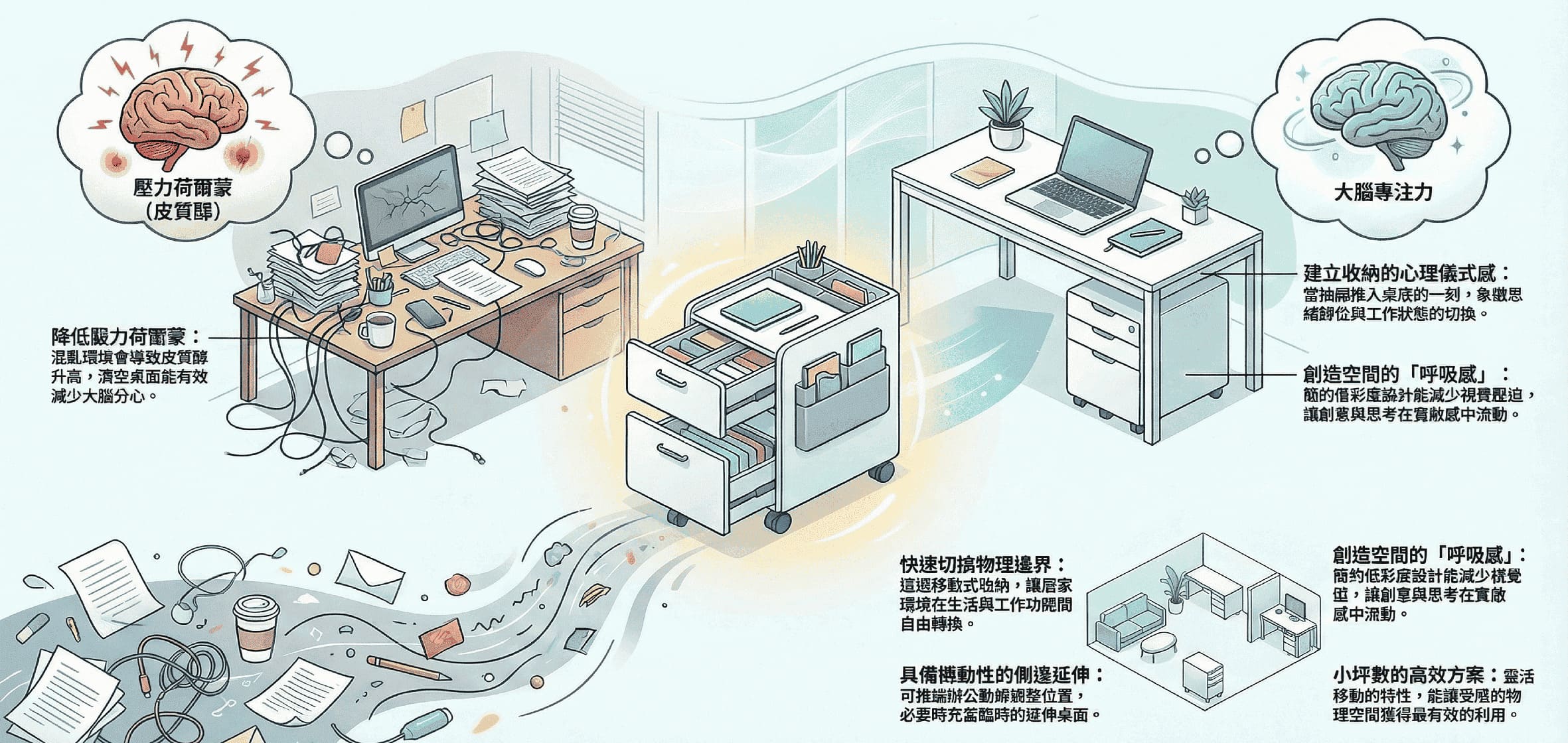 心理學研究指出,混亂的物理環境會直接導致皮質醇(壓力荷爾蒙)升高。當桌面堆滿了雜物、文件與不相關的日常用品時,大腦會不斷分心處理這些「視覺噪音」。