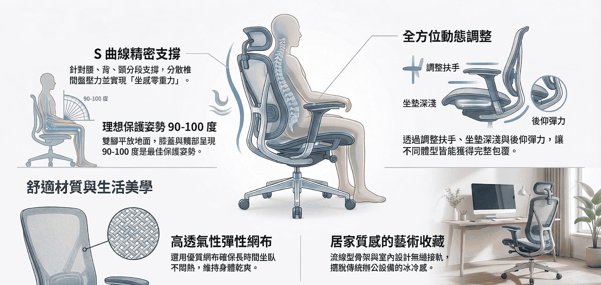 真正符合人體工學的椅子,應具備扶手高度調整、坐墊深淺滑動以及後仰彈力調節。這些細節確保了不同體型的使用者都能找到「被包覆感」。當雙腳平放地面,膝蓋與髖部呈現 90-100 度,才是最理想的保護姿勢。
