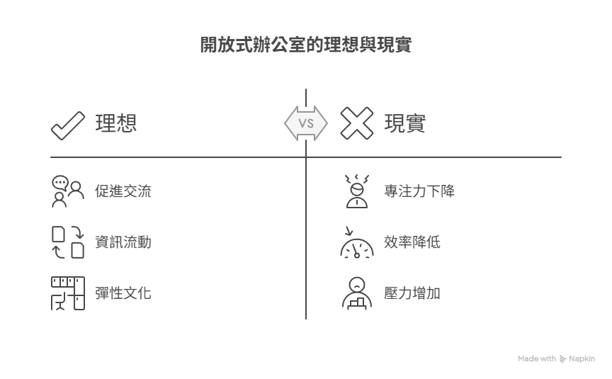 開放式辦公室的設計初衷是促進交流與合作,但如果空間缺乏安靜區域或隱私環境,過度開放反而可能讓員工更容易受到干擾,進而影響專注任務的效率。