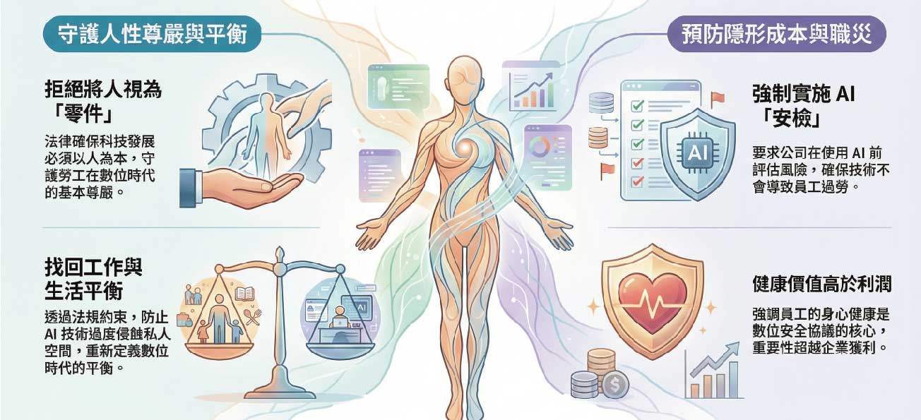 法規要求公司在使用 AI 時要先「過安檢」,確保不會造成員工焦慮或過勞,這是一個數位時代的安全協議,賺錢很重要,但員工的身心健康更重要。