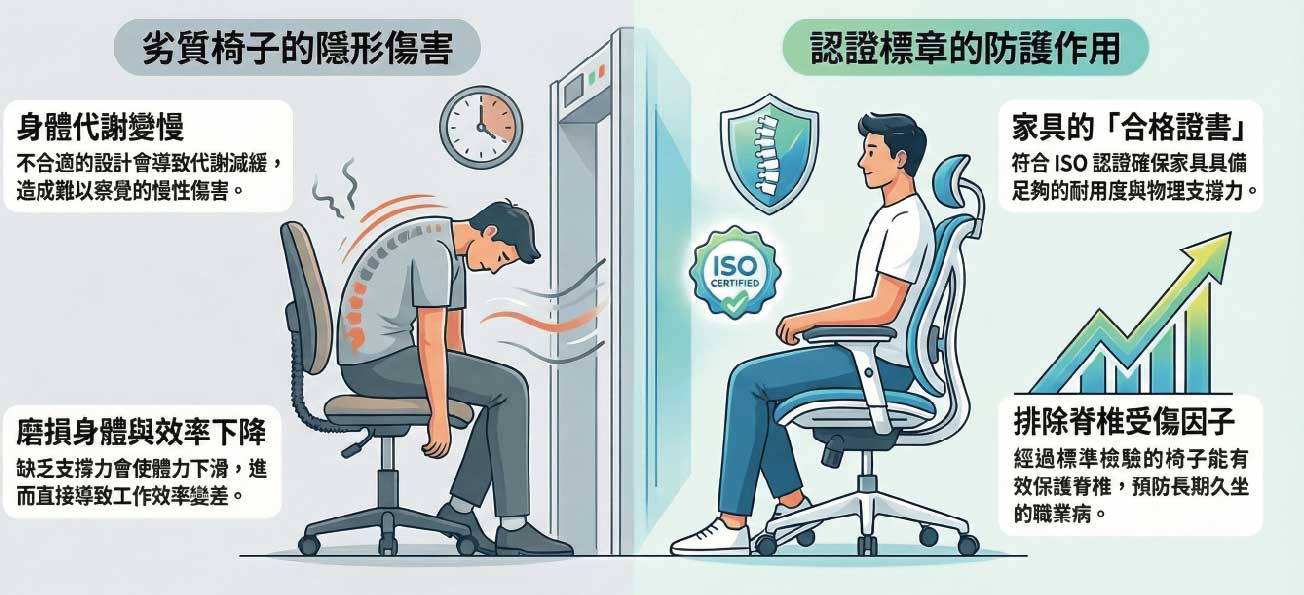 就像買電器要看檢驗標章,專業家具須符合 ISO 認證。這些認證就是椅子的「合格證書」,確保它坐久了不會斷、支撐力夠,能排除那些會害你脊椎受傷的「危險因子」。