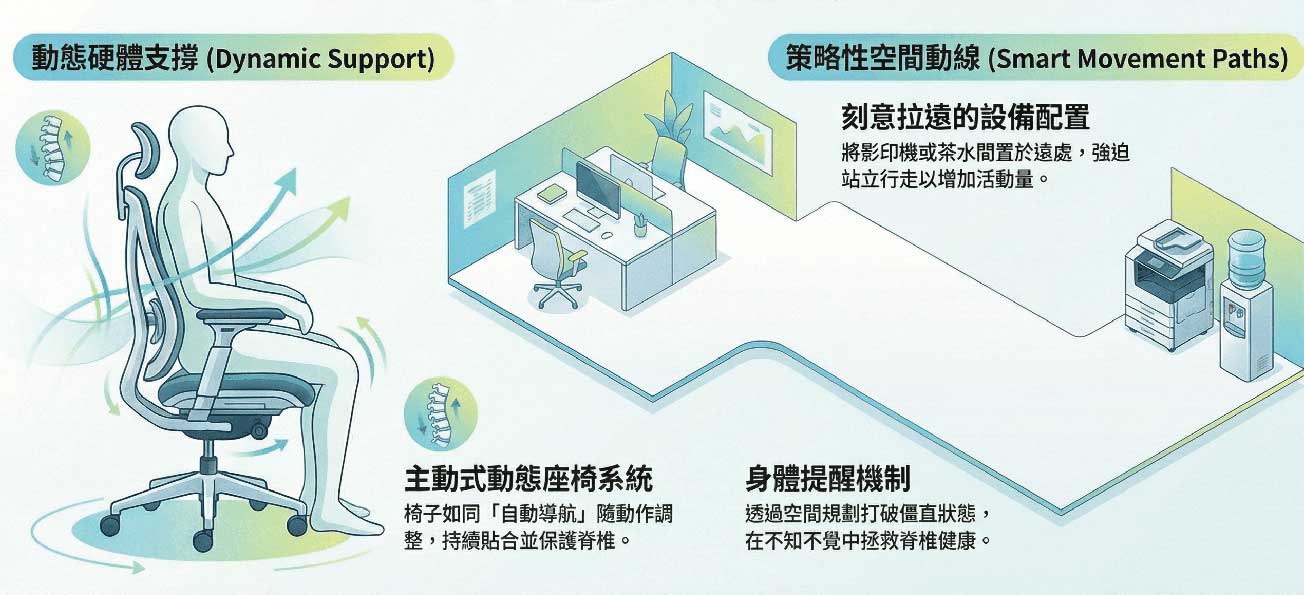 先進的辦公室會故意把影印機或水桶放遠一點,這種設計是為了強迫你「站起來走走」,打破一直坐著的死狀態,這就是一種身體的提醒機制,讓你在不知不覺中增加活動量。