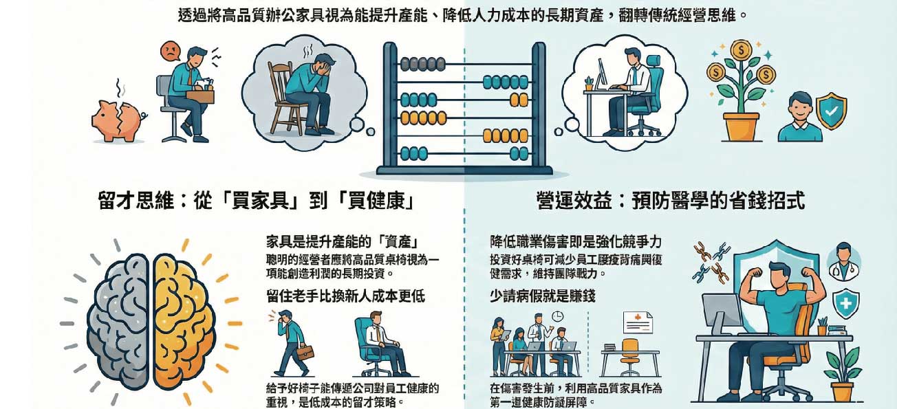 給員工好椅子,就是在告訴員工:「公司在乎你的身體」,比起不斷換新員工,給一張好椅子來留住老手,成本其實更低。把家具當作**「提升產能的資產」,才是高端的經營眼光。