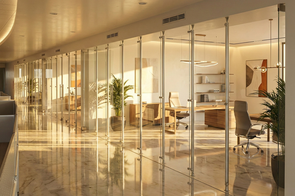 • 打破實體牆面沉重感,讓空間的視覺延伸,營造寬敞、舒暢的工作環境
