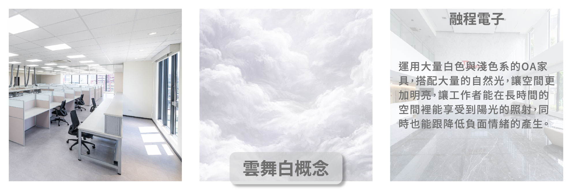 在融程電子的辦公空間案例中,我們運用了雲舞白的概念。當牆面與大面積色彩不再喧嘩,它們便退後成為了光影流動的背景。